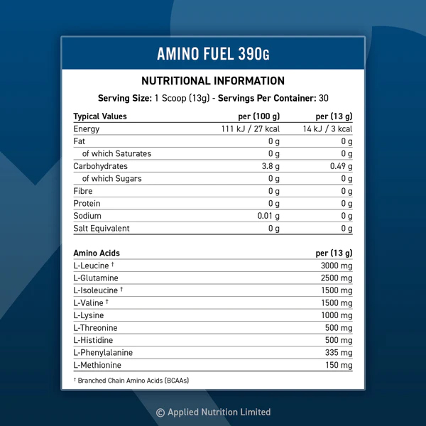 Amino Fuel EAA is the perfect optimal blend delivering 11g of aminos per serving, 9g of which are Essential Amino Acids (EAA) including 6g of Branched Chain Amino Acids (BCAAs) at a 2:1:1 ratio (3000mg L-Leucine, 1500mg L-Isoleucine, 1500mg L-Valine) with an additional 2500mg of L-Glutamine.