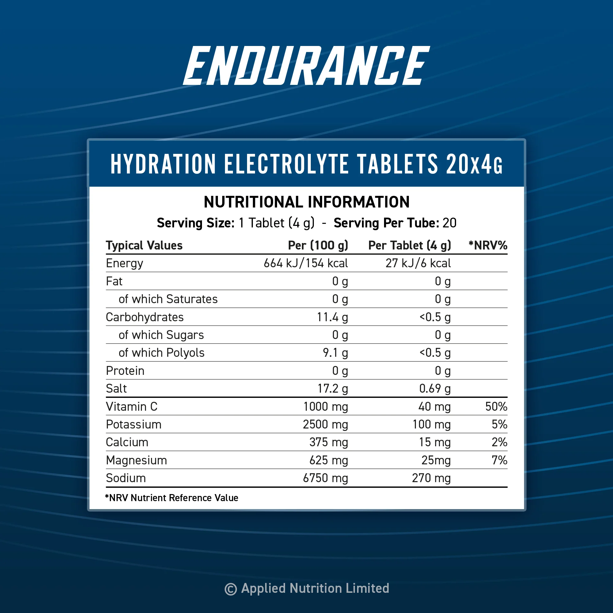 ENDURANCE ELECTROLYTE TABLETS have been carefully developed to support the requirements that performance athletes have to ward off the effects of dehydration. It's commonly understood that effective hydration levels support optimal performance and muscle function during strenuous exercise, in warm environments, or where activities take place over longer periods of time. However, water alone just isn’t enough to maintain this complex system of optimal hydration and electrolyte balances, and our hassle-free solution quickly dissolves in water to provide a functional hydration solution.