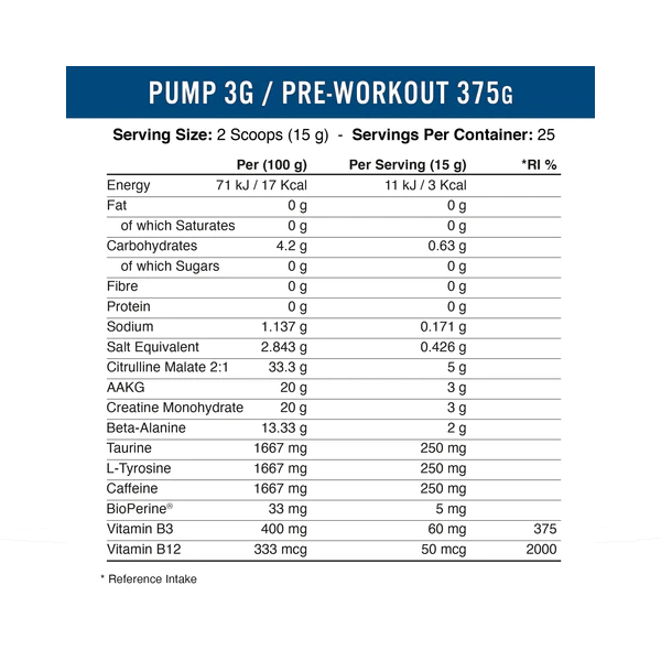 Applied Nutrition - Pump 3G (with caffein) Original is now more concentrated than ever, stacked with a host of the most popular and researched ingredients to help improve pump, focus and performance. Pump 3G was formulated whilst having the pump factor prioritised at all stages of development in order to maximise gains whilst still maintaining a potent stimulant dose.