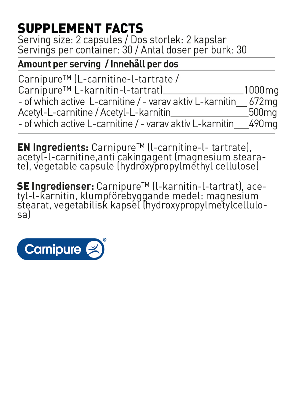 Swedish Supplements L-Carnitine is a dietary supplement that contains carnitine in two different forms: L-carnitine tartrate in form from Carnipure (Quality trademark from Lonza) and ALC Acetyl L Carnitine which in addition to the usual benefits of Carnitine also has a positive effect on concentration and focus. Carnitine is an amino acid with the task of transporting fat to the mitochondria where combustion takes place, it is found naturally in the human body as well as in the diet, especially in meat. However, carnitine is lacking in vegetable foods. A supplement especially during diet can thus help to achieve goals in diet and weight control.