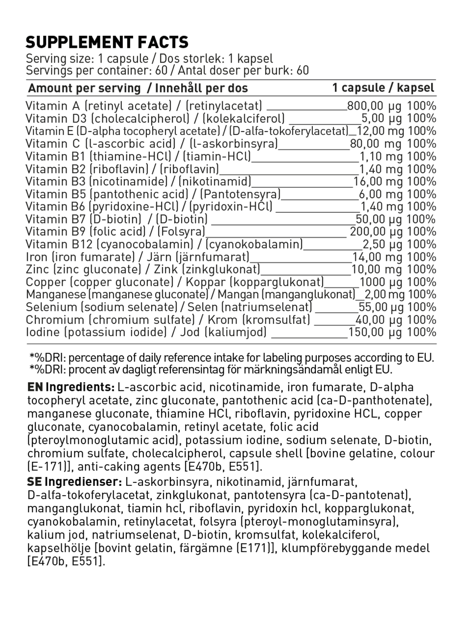 When Vitamin & Mineral complex was created, researchers from Swedish Supplements highlighted all these factors and looked at when during the day we most need different substances? What substances cooperate in synergy in the body? The answer is found in this system. Vitamin & Mineral Complex is a heavily dosed product in many cases much higher than RI (Reference Intake) as a percentage, and thus adapted to work for those who have an increased need for these nutrients. However, the dosage is developed so that with each individual substance, everyone is within the prescribed range EFSA recommended dose where the highest value is an upper limit.