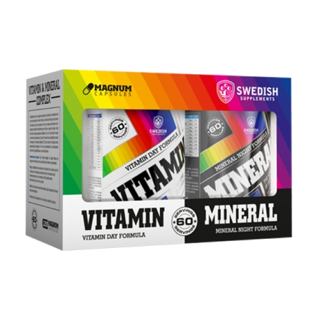 Vitamin & Mineral Complex is a dietary supplement that provides a carefully balanced dose of vitamins and minerals. Vitamin & Mineral is an AM and PM system where substances suitable to take in the morning are available in a capsule as well as substances that are common to use for recovery and rest are available in capsules for the evening. In total, there are as many as 29 active ingredients including white C and E as well as selenium for the protection of cells against oxidative stress. Zinc and vitamin D to maintain the immune system. B vitamins including B1, B2 and niacin to support metabolism. Magnesium for normal muscle function and protein synthesis as well as chromium for maintaining normal blood sugar.