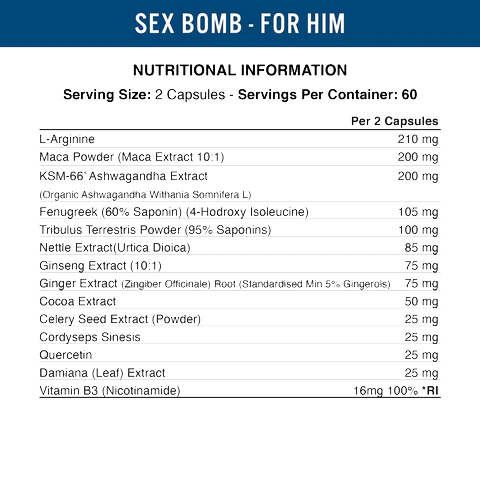 Applied Nutrition Sex Bomb for Him is a powerful male performance and vitality formula designed to naturally enhance stamina, energy, and confidence. This advanced blend combines herbal extracts, vitamins, and minerals that work together to support testosterone production, sexual performance, and overall male wellbeing.